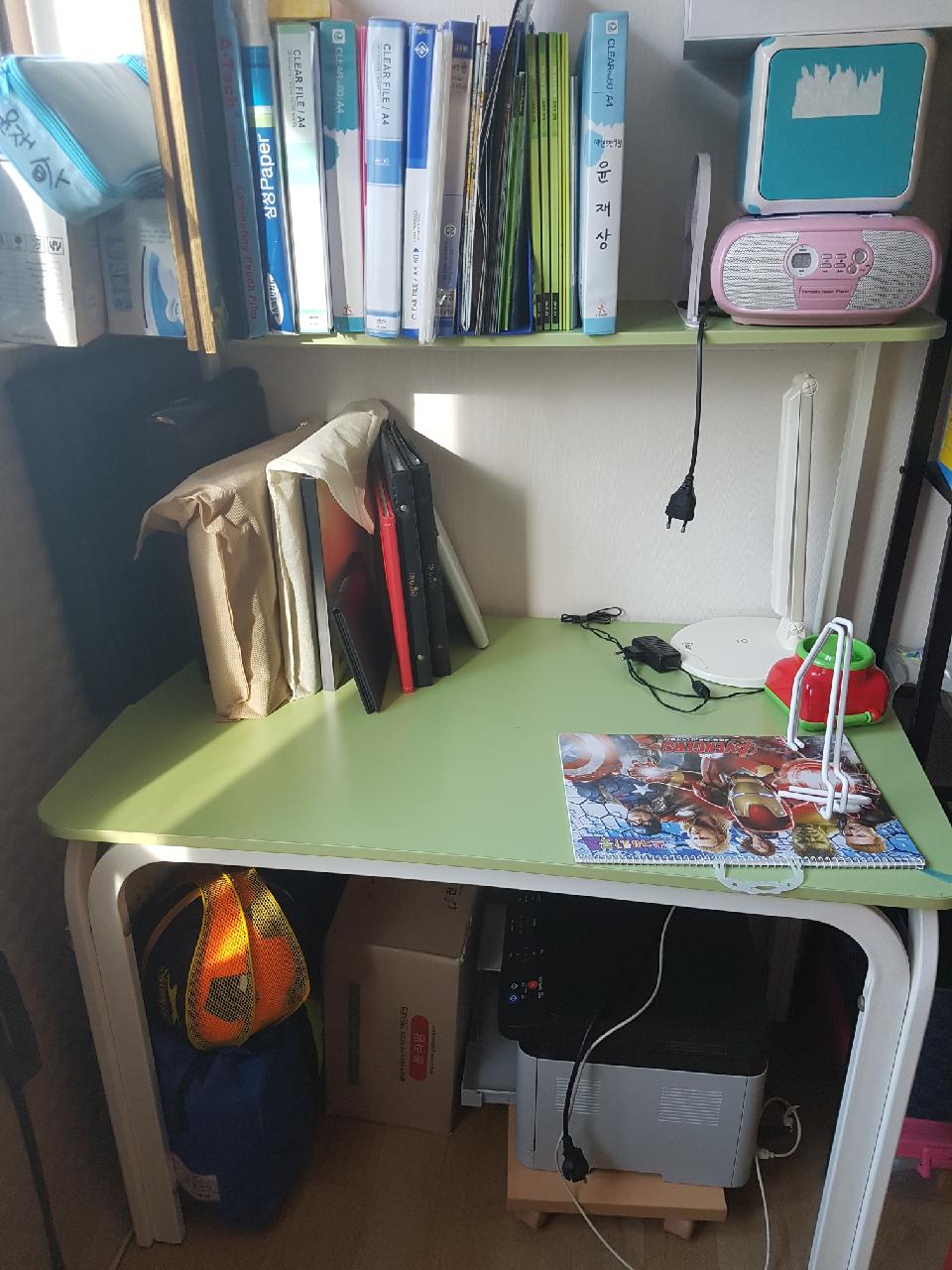 책상은 2단 책상이고 상판은 100*60*75 이단 책꽃이 까지는 130 입니다.